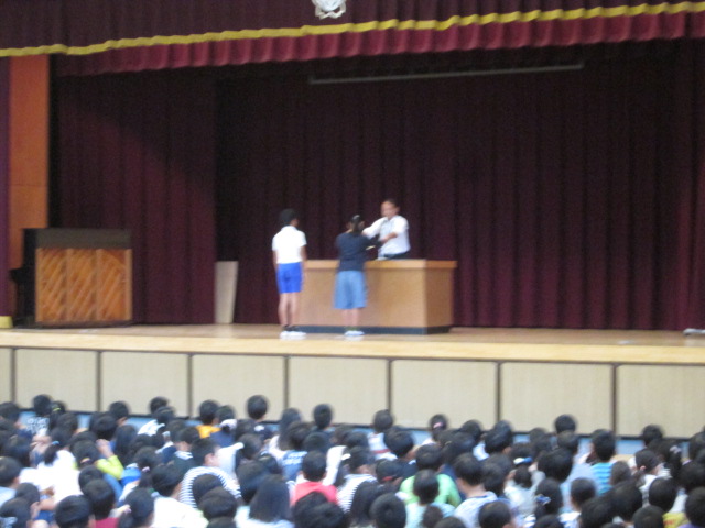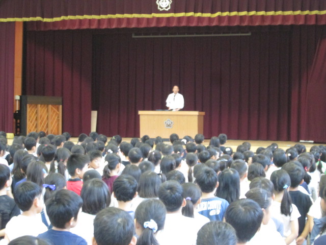 本日、全校朝礼がありました。まず最初に、校長先生のお話がありました。校長先生からは、先日の運動会について、「最後まで、全力を出して取り組んでいる姿、また、友達を一生懸命応援する姿がすばらしかった」と、全校児童の頑張りについて、お話がありました。