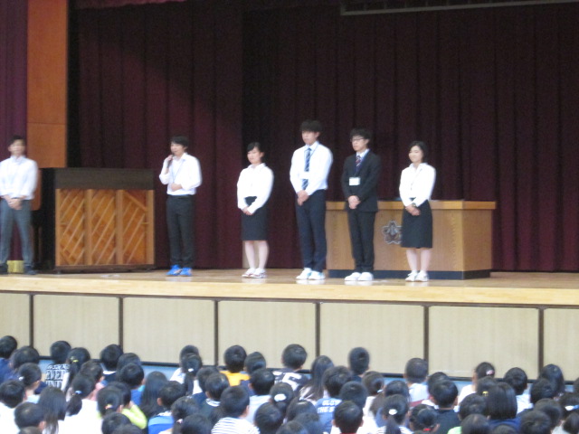 次に、教育実習生5名の紹介がありました。今日から、10月27日まで、松井ケ丘小学校で実習されます。全員、本校の卒業生です。子どもたちも大変うれしそうにしていました。子どもたちにとって、たくさんの先生とつながれる良い機会となればいいです。