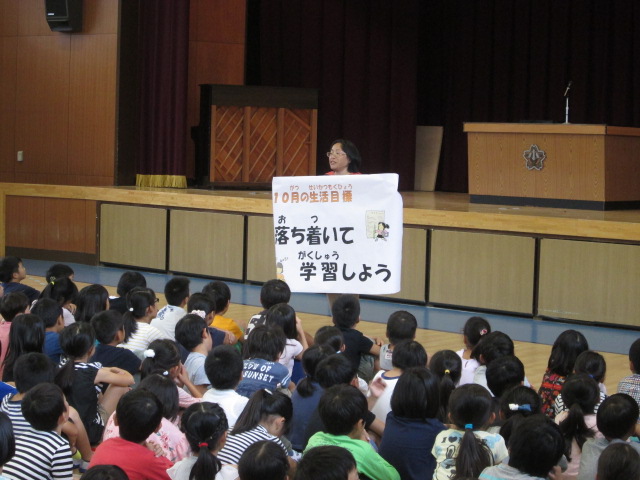 最後に、10月の生活目標についてです。10月の生活目標は、「落ち着いて学習しよう」です。運動会も終わり、また、気候もよく学習しやすい時期となりました。一人一人、目標をもって、しっかり学習に取り組みましょう。