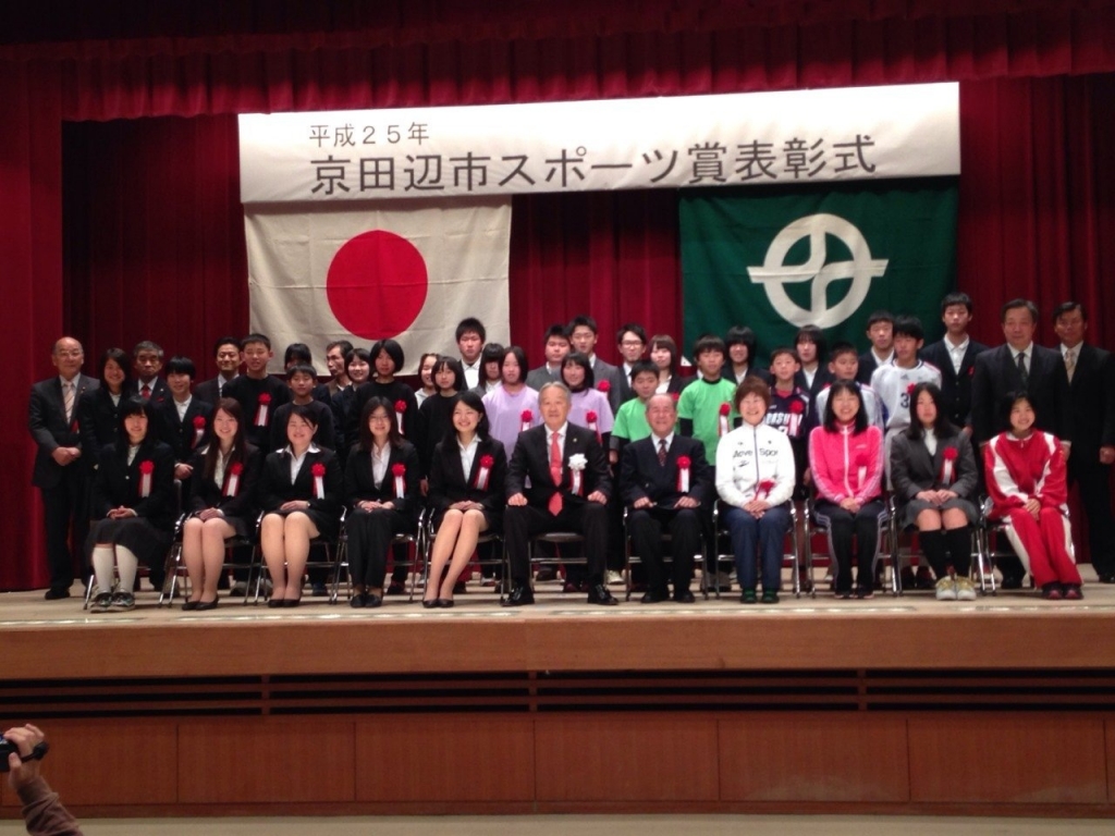 3月16日(日)に京田辺市立中央公民館で平成25年度京田辺市スポーツ賞の表彰式が行われました。本校からは、松井ケ丘小学校男子ハンドボールチームと水泳で6年の中島海聖さんが表彰されました。