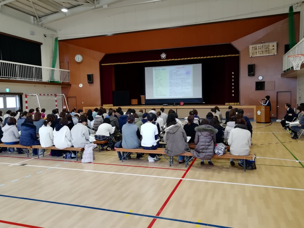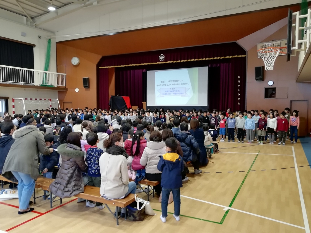 説明会が終わった頃に園児も体育館に戻ってきて、最後に本校3年生が音楽発表を行いました。「4月の入学を待ってるよ!」と、気持ちを込めて歌と合奏を贈りました。4月7日、新1年生の子どもたちが元気に入学してくるのを楽しみに待っています。