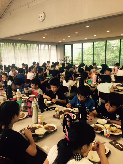 夕食の時間です。ウォークラリーでたくさん歩いてお腹が減ったので、みんな、美味しそうに食べています。