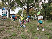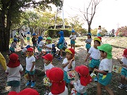 年長児はさんぽの途中で柿の木を発見し、持ち主の方から少しおすそわけを頂きました。『しぶ柿』を初めて見た子どもがほとんどで「どんな味かな?」と興味津々。みんなで小さくカットした柿をペロッとなめて「変な味がする」と顔をしかめていましたよ。五感で秋を感じたお散歩でした。