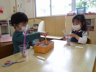お友達とジュースの色を見せ合いっこしています