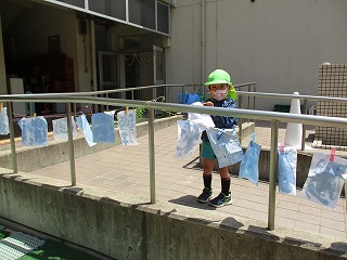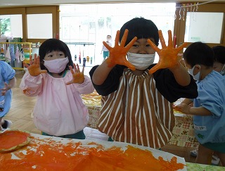 絵の具の感触にもワクワク大喜びで、思い切り遊ぶ子どもたちでした。