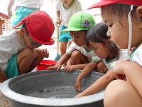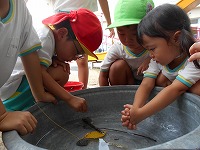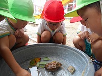 「前に来たカメの子どもかなあ?」(夏休み前に、大きなカメが幼稚園に迷い込んだのをみんな覚えていました) 「お母さんに会いたいやろうなあ」