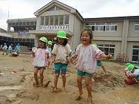 4・5歳児の子どもたちの遊ぶ姿を真似て、3歳児の子どもたちも、裸足になって泥の感触を楽しんでいました。