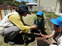 今日、4歳児の子どもたちは、トウモロコシやなすなどの夏野菜を植えました。