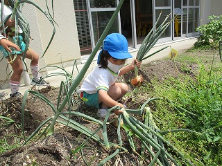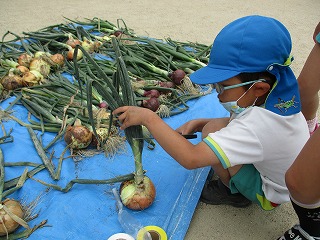 子どもたちは目を輝かせながら玉ねぎの収穫をしました。