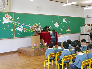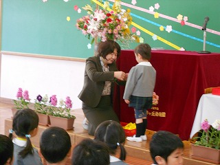 今日は3学期の終業式でした。先日の、修了証書授与式で5歳児の子ども達がしていたのをしっかり見ていたようで、4歳児の子ども達は初めての経験にもかかわらず、名前を呼ばれたら元気に返事をし、お礼をして園長先生からご褒美をいただきました。3歳児の子ども達は、園長先生からチューリップの形のご褒美ペンダントを首にかけてもらいにっこり。みんな話もしっかり聞け、1年間の成長を感じるひとこまでした。保護者の皆様には本園の幼稚園教育にご協力とご理解をいただきましてありがとうございました。新学期は、4月10日(木)よりスタートします。春休み安全と健康に気をつけて元気に過ごしてください。