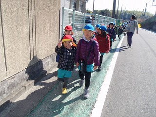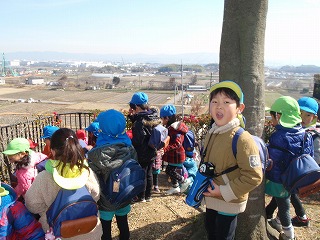 今日はお別れ散歩。春のような暖かさに恵まれ、近くの諏訪ケ原公園へ出発!「やっほー!」と、みんなで声を合わせました。。遠くには比叡山が見えました。