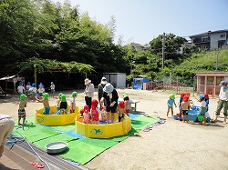 今日も午前8時前から、先生達が水遊びの準備をしています。水鉄砲の的当てや、シャワー遊び、スライムでの感触遊び、魚釣り等々、子どもたちの笑顔を想像しながらの準備です。