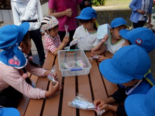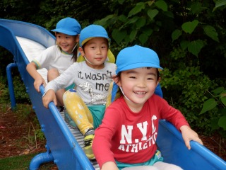 「みんなのパワーで雨も止む!」と元気いっぱい幼稚園を出発しました。