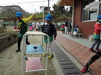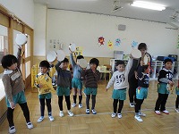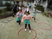 また、年少児も鬼ごっこやフープ取り遊びを楽しんでいます。いろいろな遊びを経験する中で友達同士がつながって、一緒に同じ遊びをする楽しさを感じているようです。