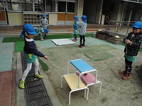 こまがまわせるようになった年長児は「難しい回し方をしよう」と、ベンチを積んで、1階、2階、3階とそれぞれの場所で回そうと頑張っています。