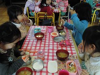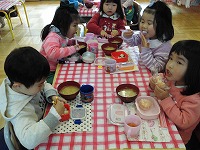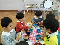 「おいしいなあ」「お肉が入ってる」「あったかい~」と嬉しそうな子ども達。野菜が苦手な園児には負担にならない様に少しずつ入れたり、何回もおかわり出来る様にしたり等個々に応じて美味しくいただける様に工夫しています。