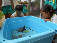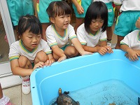 子ども達は亀を囲んで、「何を食べるかな?」「水はどれくらいいれたらいいのかなあ?」