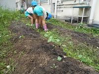 亀の様子を見た後は、5歳児の子どもたちは、黒枝豆を畑に植えつけました。