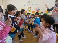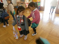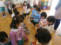 素敵なネックレスのプレゼントをもらって、うれしそうな3歳児さん。じっと眺めている子どももいました。また、かわいらしい手遊びも一緒にして、楽しいひとときを過ごしました。
