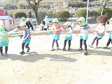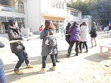 24日はお母さんたちの「ほっとほっとサロン」でした。PTA活動の一環のベルマーク活動の収益でつなひきの綱をいただきましたので、みんなで綱引きをすることになりました。早速綱引き大会の始まり・・・。はじめは、遠慮がちだったお母さんも一旦綱を握ると体中の力をふりしぼり同じチームのお母さんたちと力を合わせて「よいしょ、よいしょ」 新品の綱なので切れることはないのですが、ちょっと心配・・・・・・・・。