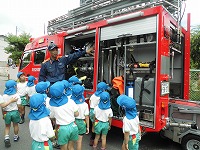 最後は、消防自動車を見学し、普段はなかなか見られない消防車の装備を見せてもらいました。何があるのか、興味津々で食い入るように見つめている子もいました。