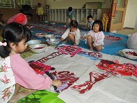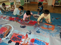 5歳児の子どもたちは、早速消防車を表現しようとみんなで、大きな紙に思い思いに描きました。