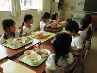 最後は、「また、秋に来てくださいね」と小学校の先生に見送られルンルン気分で幼稚園に戻りました。初めての松井ヶ丘小学校の給食は、期待とうれしさで特別美味しかったのではないでしょうか。