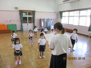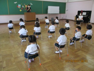 園長先生と、4月からの楽しかった出来事を振り返りました。そして夏休みには「やってみよう」とチャレンジしてみてくださいね。とお話がありました。