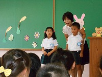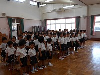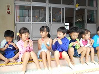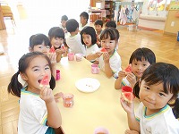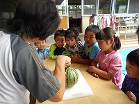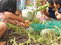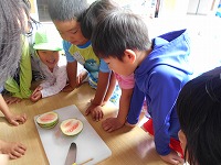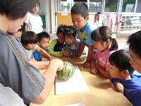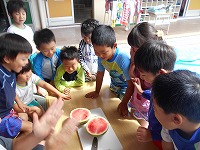 始業式を前にした、8月の終わりの登園日。畑でスイカを収穫しました。このスイカは、松井ケ丘幼稚園の園児さんが種から苗に育て幼稚園に持って来てくれました。みんなで毎日水やりをし、夏の日差しをグングン浴びて、大きなスイカと少し小さいスイカができました。「おいしそう!!」「縞模様が入っている」「中は、赤いかなあ?」「おいしいかなあ?」と畑のスイカを囲んで話が盛り上がりました。「赤いかなあ。」「甘いかな。」「黄色いかなあ」「種がいっぱい入っているかなあ」とドキドキワクワク・・・。子どもたちの目の前で切ってみると・・・。 中から赤い色が見えた時は、「赤い!!」「おいしそう!!」と拍手と大歓声!! 「甘い!」「おいしい!」と思わず笑顔がたくさんこぼれていました。せっかくなので、3歳児さんと4歳児さんにもお裾分けすることになりました。「お家でも食べたことある」「おじいちゃんの家にもあった」「おいしいね」など話を弾ませながら、喜んで食べていました。そして、スイカの種は、、、「次の夏には小学校に行くから、すみれ組さんにあげる」と、すみれ組さんに預けることになりました。来年も収穫できるといいですね。今日から2学期がスタートしました。新しいお友達が2人、ひまわり組にきてくれました。新しいお友達とも仲良しになって元気に過ごしたいと思います。 保護者の皆様、地域の皆様、2学期もどうぞよろしく願い致します。