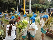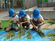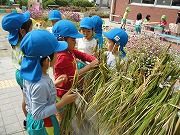 6月に田植えした稲が、お米を実らせました。5歳児の子どもたちが稲刈りをしました。「どうして食べようか」と考える前に、しなくてはならない事がいっぱいあります。お米は八十八の手間かけて育てると言いますから、すぐには食べられそうではありません。今日は束ねて稲を干します。職員の中には実家や親戚が農業をしている家がありますので、知恵や経験を出し合って、美味しく頂ける日を楽しみに待ちたいと思います。