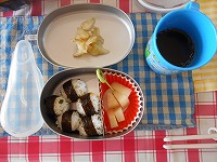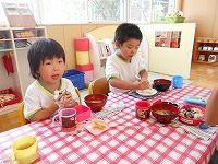 子どもたちがおにぎりを持ってきて、園で調理したお味噌汁やおかずをいただく