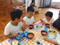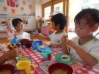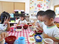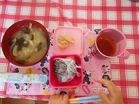 おうちの方が愛情をたっぷりこめて、作っていただいたおにぎりは、とってもおいしそうで、子どもたちも「早く食べたい」、「ママがギュギュってしてくれた。」とみんなそろっての「いただきます」がまちきれないず、ぞわそわした様子も見られました。