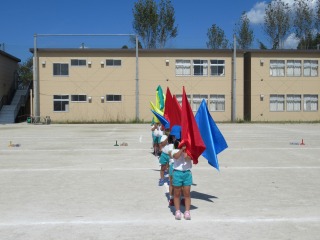 子ども達は、それぞれに自分の色の旗を持って表現します。