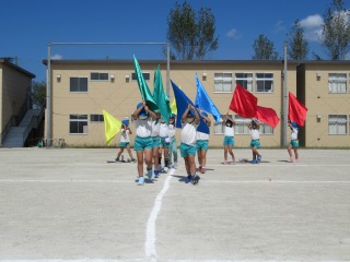 子ども達が、体全体をつかって振る旗が、