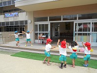 リズム遊びでは、最初は5歳児の踊る姿を見ていた3歳児が、見よう見まねで踊り始めました。「もう1回!」「もう1回!」と何度も繰り返し、お気に入りの曲になり、リズムにのって遊ぶ姿がみられます。