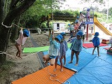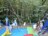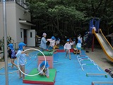 年長組のアスレチック遊びです。もうすぐ行くお泊まり保育に思いをふくらませ、遊んでいます。それぞれの遊具を組み合わせ変化のあるコースです。「できるかな?」と挑戦しながら、友達と力を合わせたり励ましたりしながら遊んでいます。お泊まり保育では本物の山の探検をします。今から、体や心を鍛え楽しみにしています。
