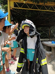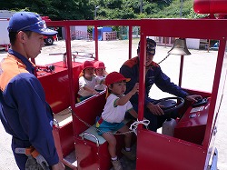 次は園庭で大きな消防自動車に触れたり、見たりしました。その後、ミニ消防自動車に乗せて頂き園庭をひとまわり。