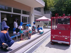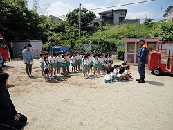 幼稚園に消防自動車がやってきました。歓声の中、まずは防火のお話や映画の上映がありました。花火遊びの注意や火遊びをしないお約束など真剣な面持ちで話を聞きました。