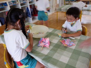 年中組さんは貝つなぎに星飾り、織姫彦星飾り、野菜の飾りを