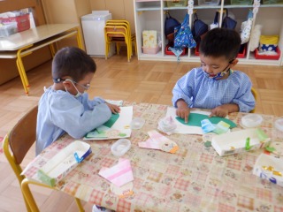 のりをチョンっと指でとって丁寧に塗る姿がありました。