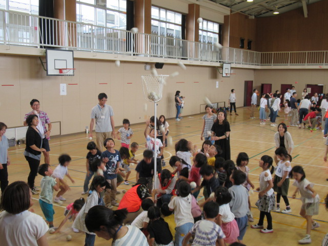 1年生は体育館で参加された保護者の方々と一緒に玉入れやボール送りゲームを楽しみました。