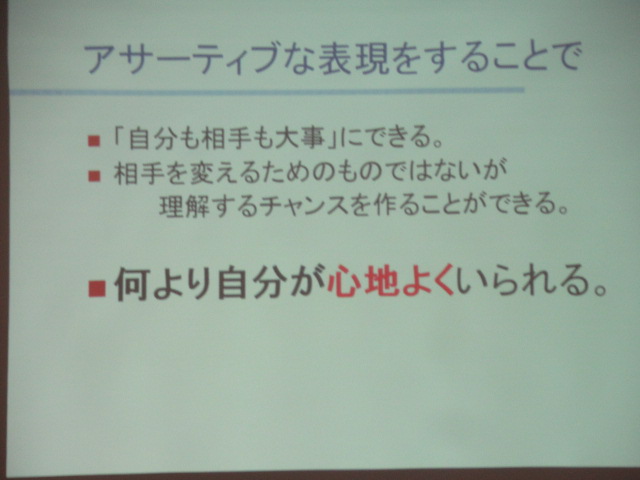 アサーティブコミュニケーションとは、「自分の考え・気持ちを、自分と相手の気持ちを大切にしながら、その場に合った方法で伝える」という意味です。