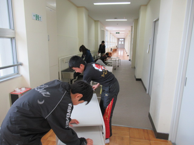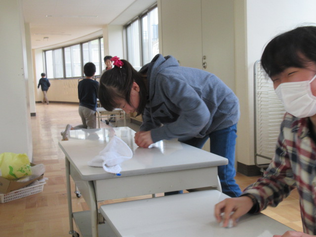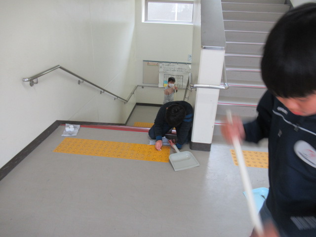 3月16日(金),6年生の校内美化作業です。今回は,各教室の給食台と西校舎の階段を重点的に行いました。