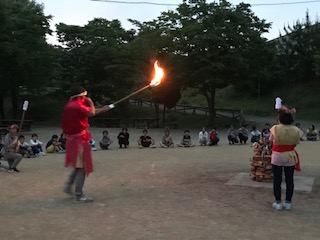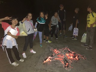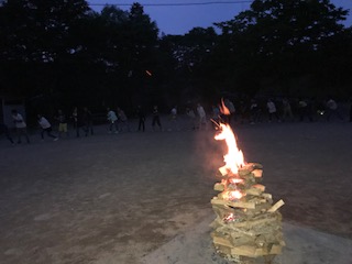 みんなが集まりました。いよいよキャンプファイヤーの始まりです。トーチの火を薪に点火すると火は大きく燃え上がり,子ども達の気持ちも高まります。