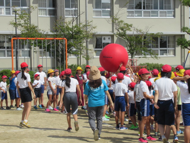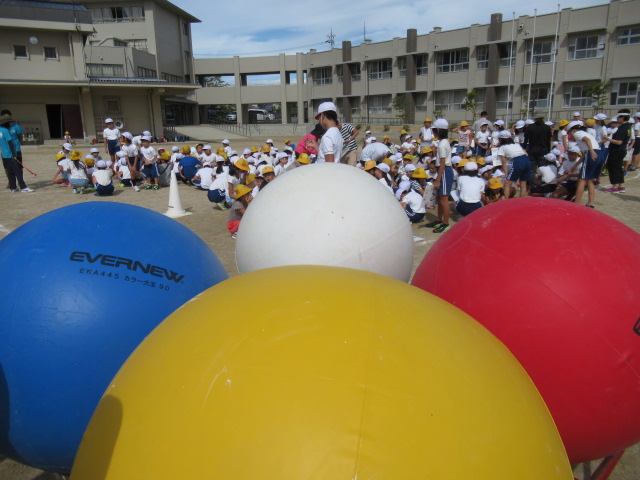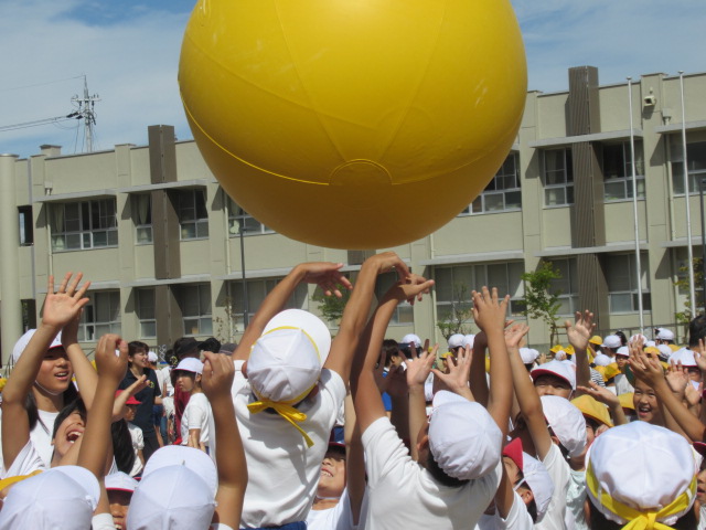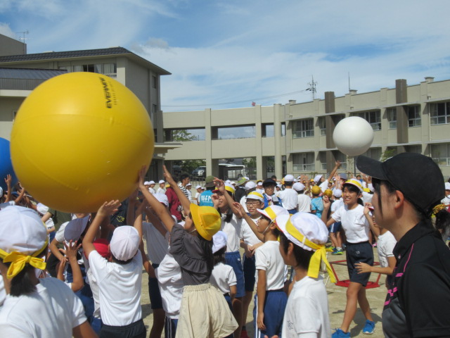9月11日(火)、児童会種目「大玉おくり」の色別練習を行いました。「大玉おくり」は、各色ミヤマキッズグループごとにU字型に並び、頭上に来た大玉を落とさないように手で送っていく競技です。児童会本部のルール説明の後、試しのゲームをしてみました。