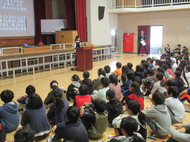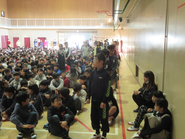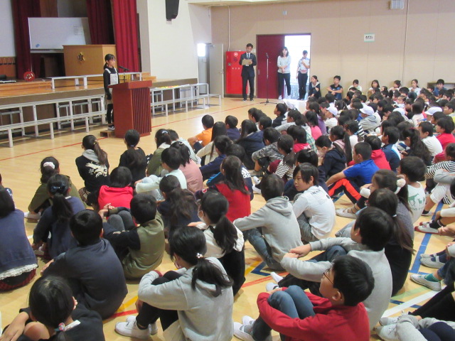 11月12日(月)の全校朝礼では、先日行われた京田辺市小中学生英語スピーチコンテストの入賞児童と来月2日(日)に行われる小中学生の主張大会に出場する児童の発表があり、みんな静かに聞き入っていました。