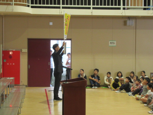 また、先週の土曜日(11/10)に行われた綴喜小学生駅伝大会の結果報告もあり、全校児童から大きな拍手をもらっていました。最後に「こども110番の家」について説明がありました。