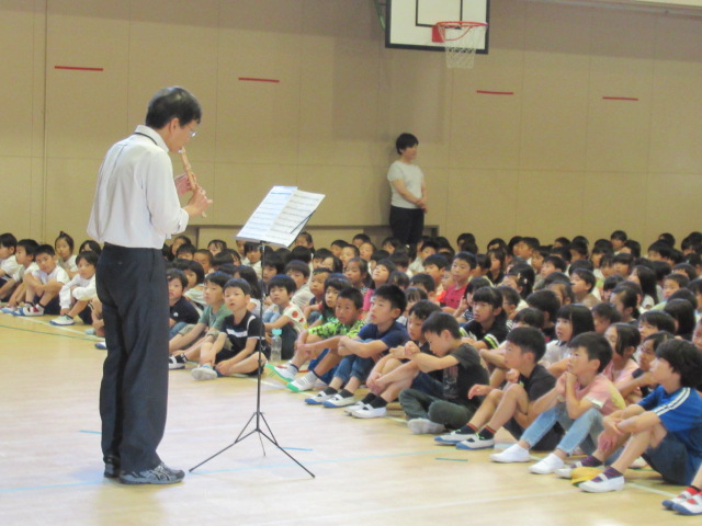 6月3日(月)、月初めの朝礼は校長先生のリコーダー演奏「やってみよう」で始まりました。自分からすすんで笑顔であいさつすることの大切さについて、教職員6名の寸劇を交えたお話がありました。