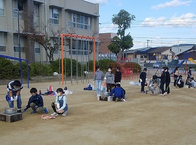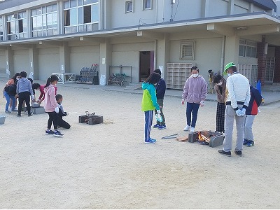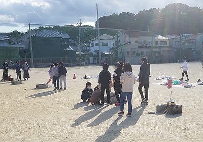 たくさんの地域ボランティアの方にもお手伝いいただき、前半はかまど作り。夕食のためのお湯を沸かします。無事火はついたようで、この後簡単調理を行い、少し早い夕食です。