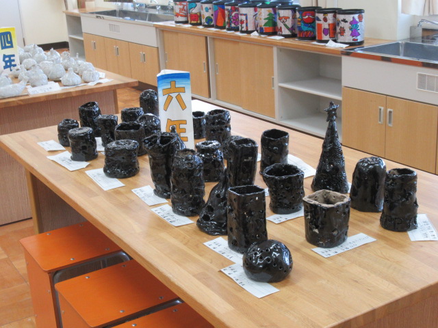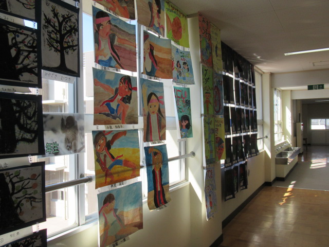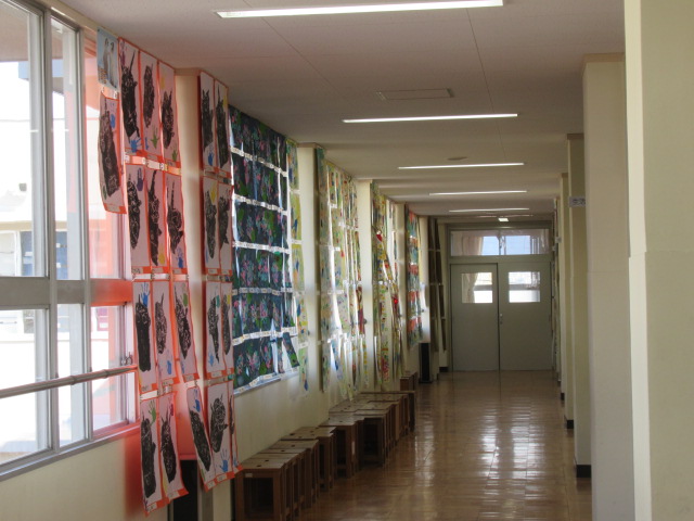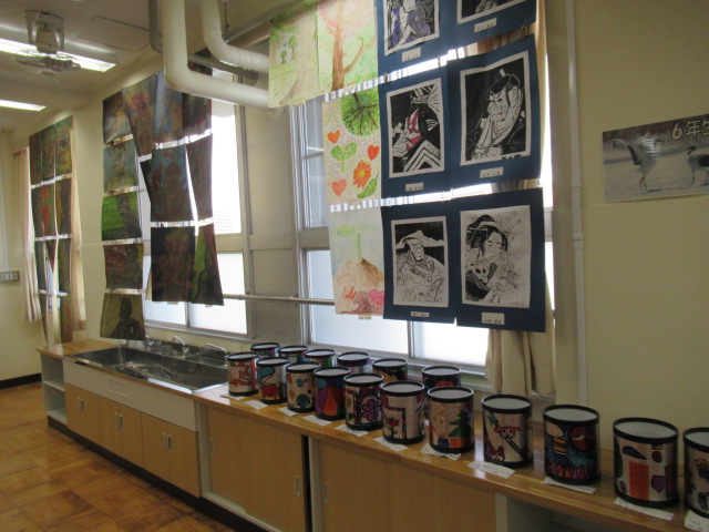 全校児童の図工作品を,一人1点ずつ出品しています。図工室のテーブルには学年毎の立体作品と両側面に5・6年生の絵画作品,廊下には1~4年生の絵画作品を展示しています。